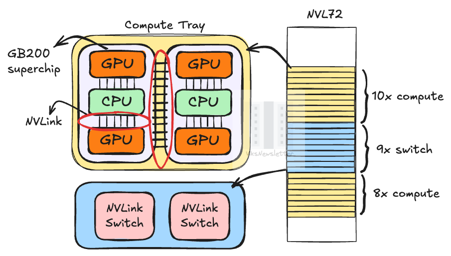 A single NVL72 rack has 18 compute trays and 9 switch trays. Every compute tray has 2 GB200 superchips, each of which contains 1 Grace CPU and 2 Blackwell GPUs. Thus, for 18 compute trays, there are 18×4 = 72 GPUs. Also, each GPU has 18 NVLink 5.0 (Nvidia proprietary PHY) links, which means that a total of 72×18 = 1,296 ports are required to hook them all up so that all GPUs are interconnected.