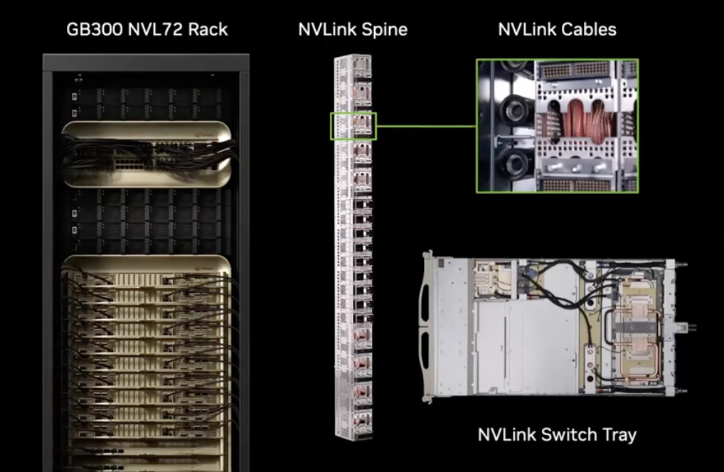 Compute fabric: A detailed look at how GPUs are hooked up in a rack using NVLink as an example.