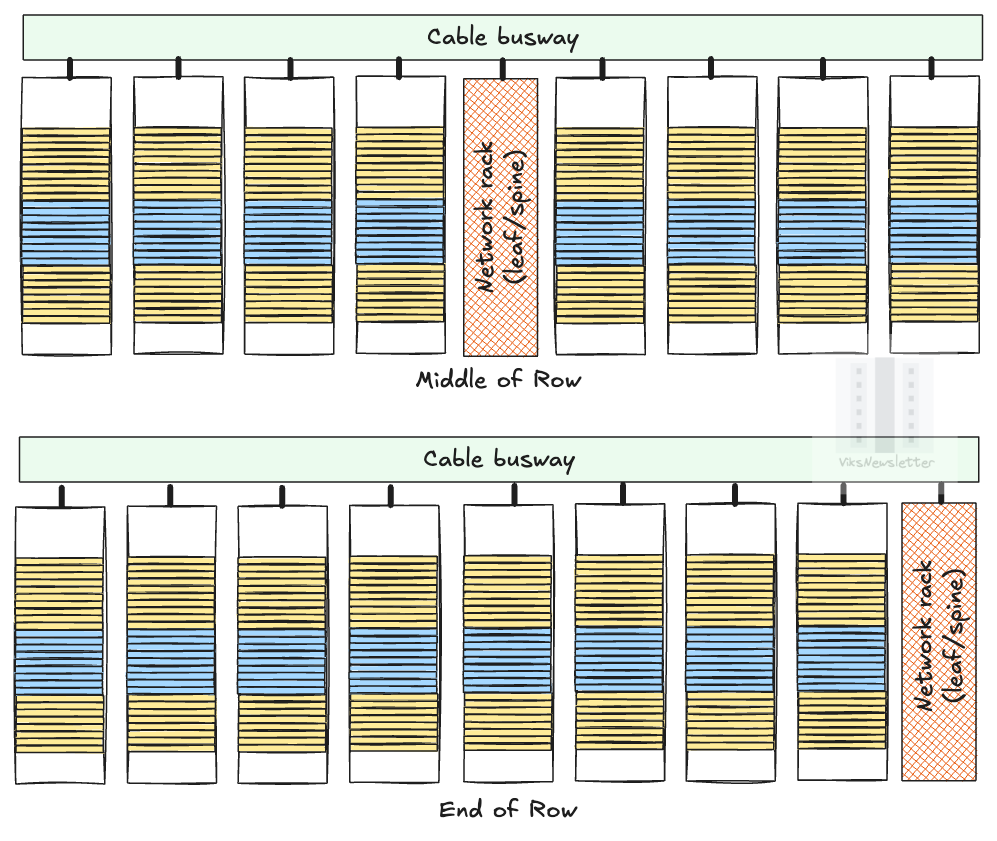 Another approach to hook up racks together is to put all the switch gear into its own rack which may be placed in the middle of the racks in a pod as shown below (Middle-of-Row) or at the end of the row (End-of-Row). This is the approach Nvidia is taking in its DGX Superpod.