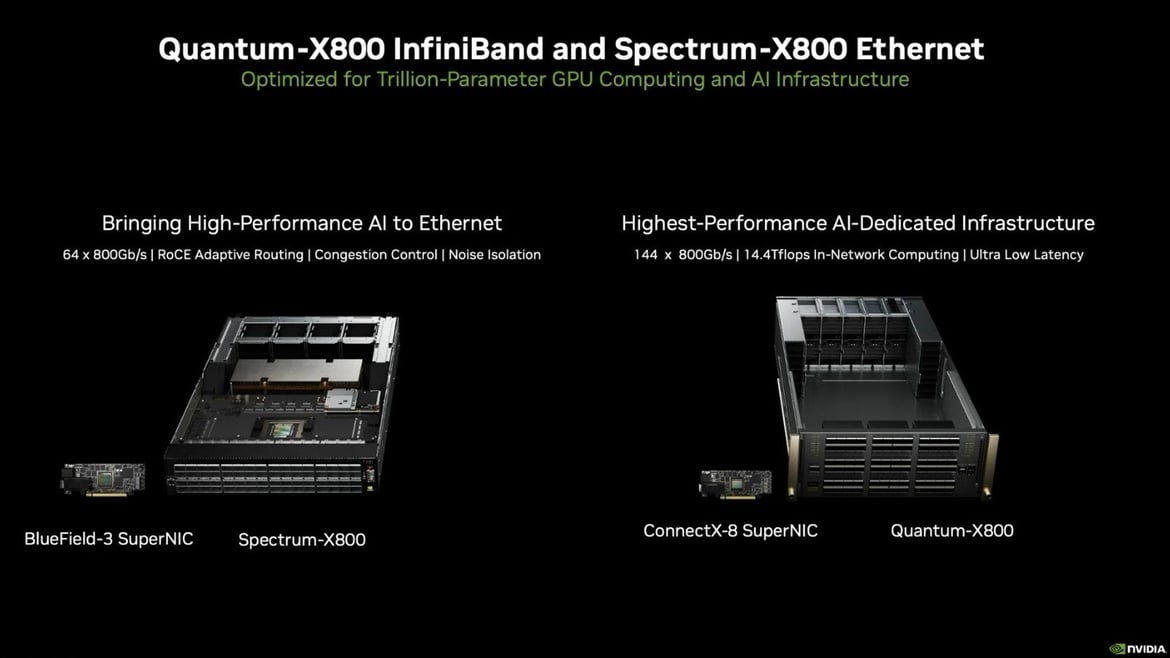 Nvidia’s latest solution for inter-rack networking is the Quantum-X800 switch that supports their proprietary InfiniBand standard. The Quantum-X800 has a total of 144 ports that can be used to make connections between GPUs in the rack and other leaf switches in neighboring racks in a pod.
