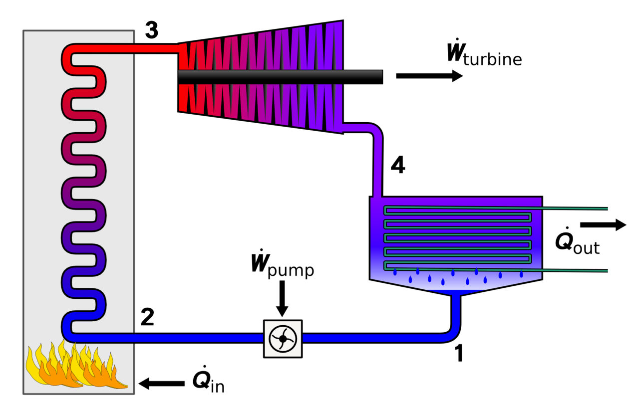 The Rankine cycle is the workhorse of large-scale power generation. Heat from burning coal or from nuclear fission boils water into steam, that steam drives a turbine, and the turbine generates electricity. The conversion is: thermal → mechanical → electrical. Coal and nuclear plants run on the Rankine cycle, and they are water hungry because steam is the working fluid. Nuclear reactors are actually more “thirsty” than coal plants due to their lower thermal efficiencies, primarily stemming from lower reactor temperatures used for the safety of reactor walls.