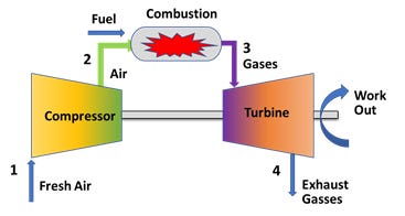 Using natural gas to power jet engines and produce electricity → aeroderivative simple-cycle turbines using the Brayton cycle