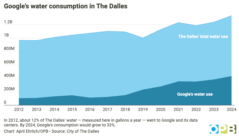 Google’s Oregon datacenter water usage comes from the use of evaporative cooling to cool their chips (high water usage), while their power source uses hydroelectric power from the grid via the Columbia River dams. Hydroelectric power itself does not consume water if it is running water, but evaporation from dams is a major problem and puts water consumption for unit energy produced as energy at >10,000 gal/MWh.