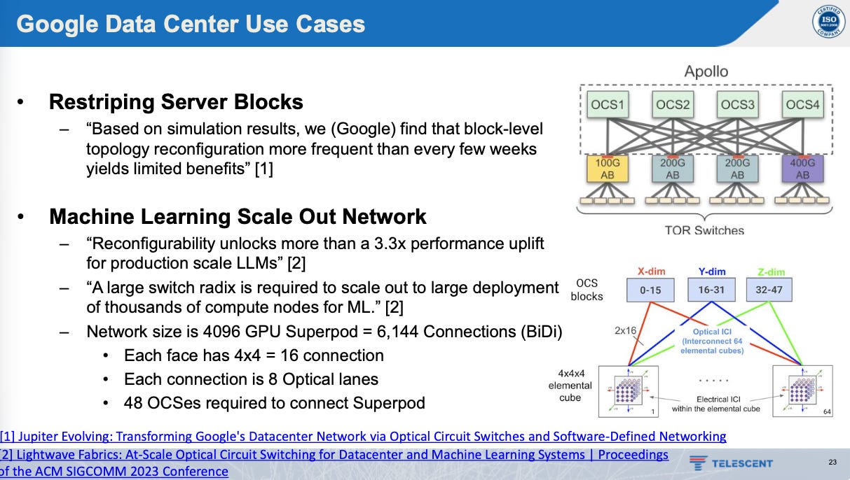 Google was the earliest to deploy OCS in their Jupiter network architecture of which the OCS part was called Project Apollo. Their early deployments were based on in-house MEMS OCS switches, but of late Google has been switching to commercial MEMS OCS providers like Lumentum. Lumentum’s last earnings call stated a $400M order backlog in OCS hardware that was net-new to the company, from three different customers. Coherent is also increasing customer engagements with a growing backlog of OCS QoQ.