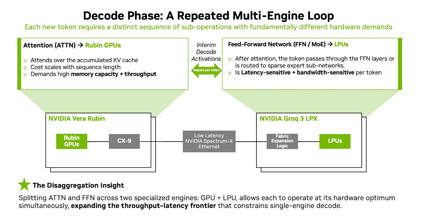 But this is comparing apples and oranges: the LPX is bandwidth optimized hardware for decode while the CPX was designed to be more FLOPs-heavy for prefill. The real question is if separate hardware like CPX is required for prefill, or if it can just be handled by the HBM-based Rubin. Now, the decode phase is disaggregated further.