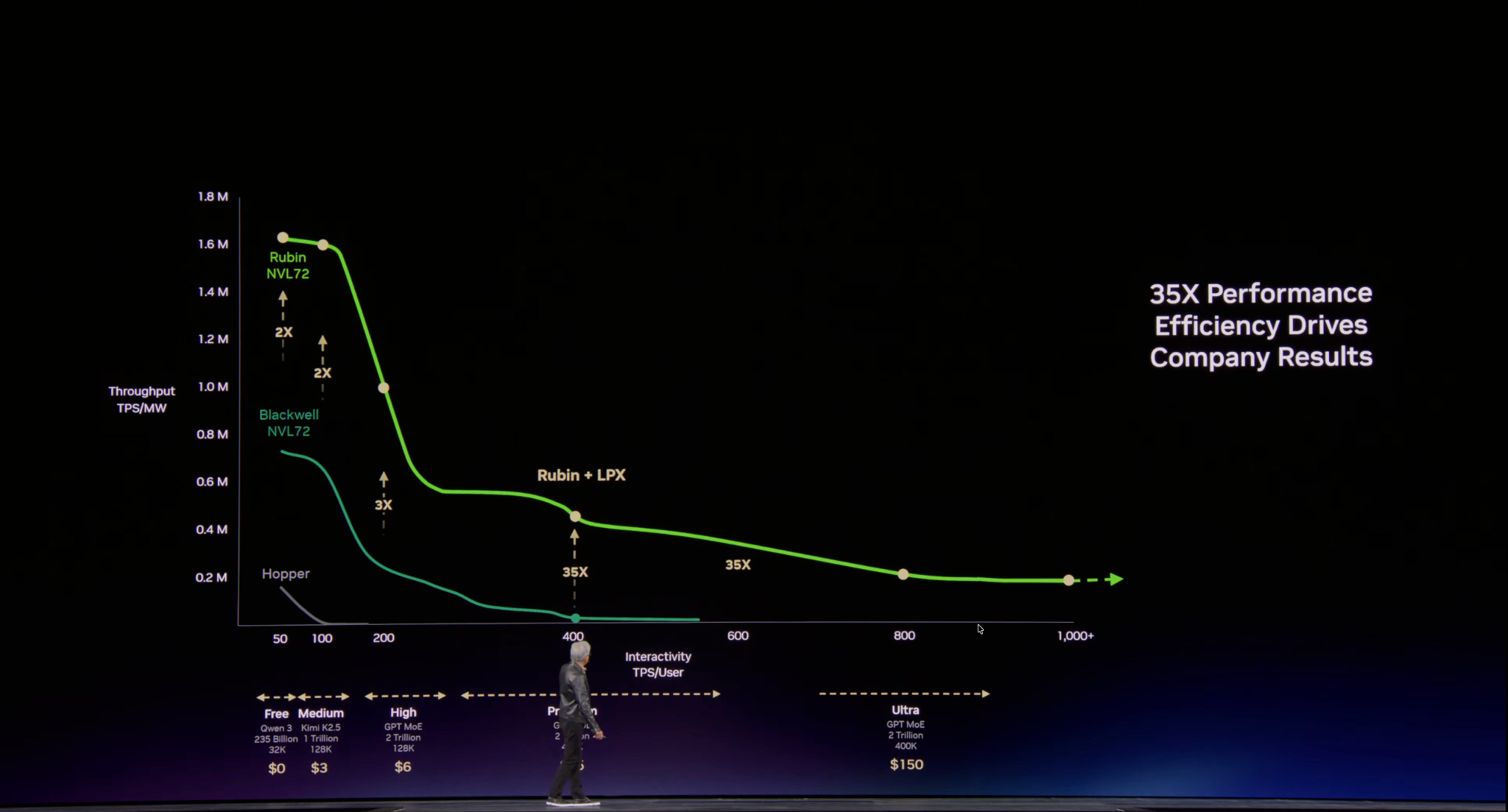 The addition of LPX racks unlocks a new token generation speed that was previously impossible with just GPUs alone. The graph below shows the token throughput on the y-axis - a measure of how many tokens/sec can be generated (normalized to power), versus interactivity on the x-axis - a measure of the user experiences speed in terms of tokens/sec available per user. Ideally, we want to be on the top right of the chart, but this is usually not possible due to simultaneous compute and memory bandwidth limitations.