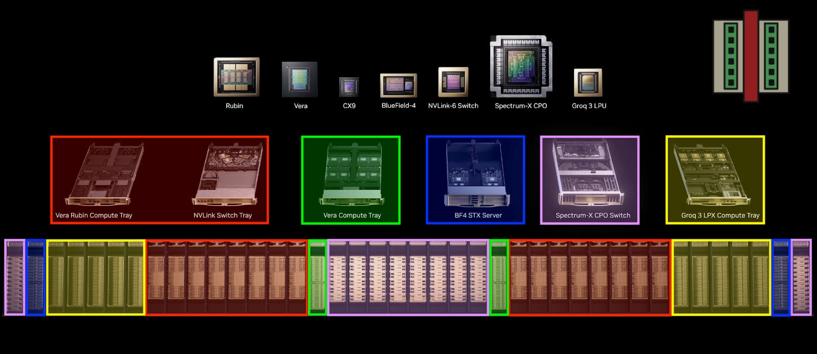 With the introduction of the Groq LPX chips, Vera-Rubin has 7 different kinds of chips that can all be integrated into racks that comprise the entire system. The keynote highlighted where each of these racks go in the entire pod, which I color-coded as shown below. This pod architecture reveals quite a few interesting details which we will explore in this post.