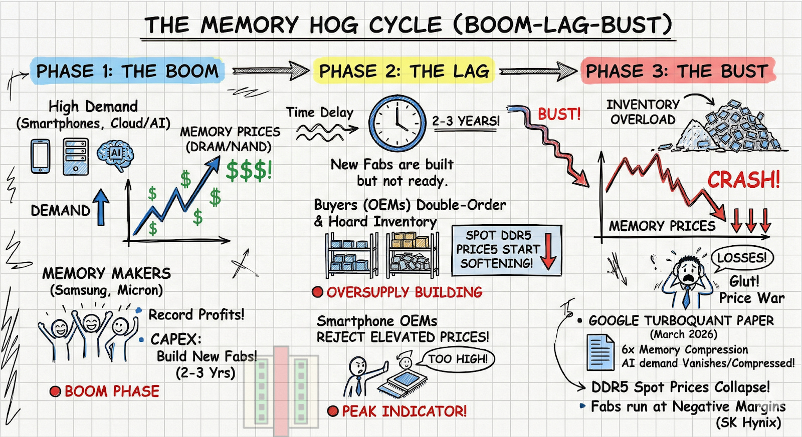 Last week on this newsletter, we discussed how TurboQuant works and how it signals another step along the path of algorithmic optimizations that is decoupled from the need for memory in AI systems. In the latest episode of Semi Doped, Austin (of ChipStrat) and I wondered why memory investors are the most skittish of the lot when it comes to innovation. It turns out there is a good reason: repeated boom-bust cycles - some of which we will visit in this post.