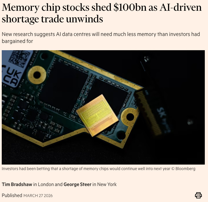 It seems like the memory downturn in the past week is one for the history books, largely driven by fears around TurboQuant, and more importantly another catalyst worth discussing: the PC/smartphone industry. Shares of Micron, SanDisk, SK Hynix, and Samsung are all down 20-30% from their recent peak. I’m guessing we will talk about this for years to come.