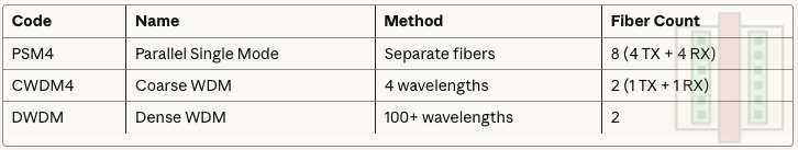 CWDM4: 4 wavelengths used for coarse wavelength division multiplexing