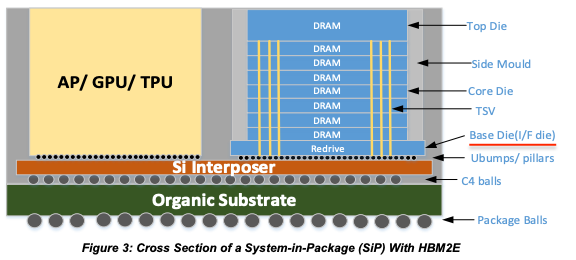 The base die distributes power to the DRAM stack and as stack heights get taller, the IR-drop should be minimized by optimized layout of through-silicon-vias (TSVs) to efficiently deliver voltage to operate the memory banks. For example, SK Hynix put power TSVs all around the base die to reduce the overall voltage drop in HBM3e.