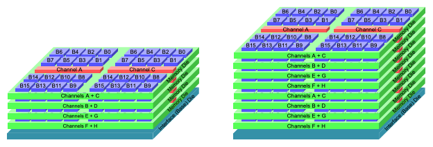 The 4-high DRAM is organized into eight channels A through H which can be operated completely independent of each other. Each channel is further divided into two pseudo-channels which are only partially independent of each other because they share the command clock and row/column address inputs. In HBM2e, each of these channels were read out on a 128 bit bus which resulted in a total number of 128 bits × 8 channels = 1,024 I/O pins. This is where the high bandwidth capability of this memory comes from. To get even more data capacity per channel, the 4-high stack is piled on top once more to make it 8-high.