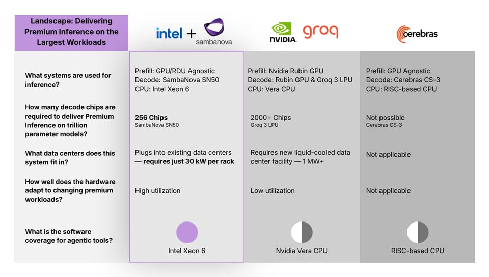 Just like we saw Nvidia pair Rubin GPUs with Groq LPUs and Vera CPUs, Intel and Sambanova are collaborating to provide specialized decode hardware and CPUs. Their comparison table below is interesting and points out something important: the number of decode chips required.