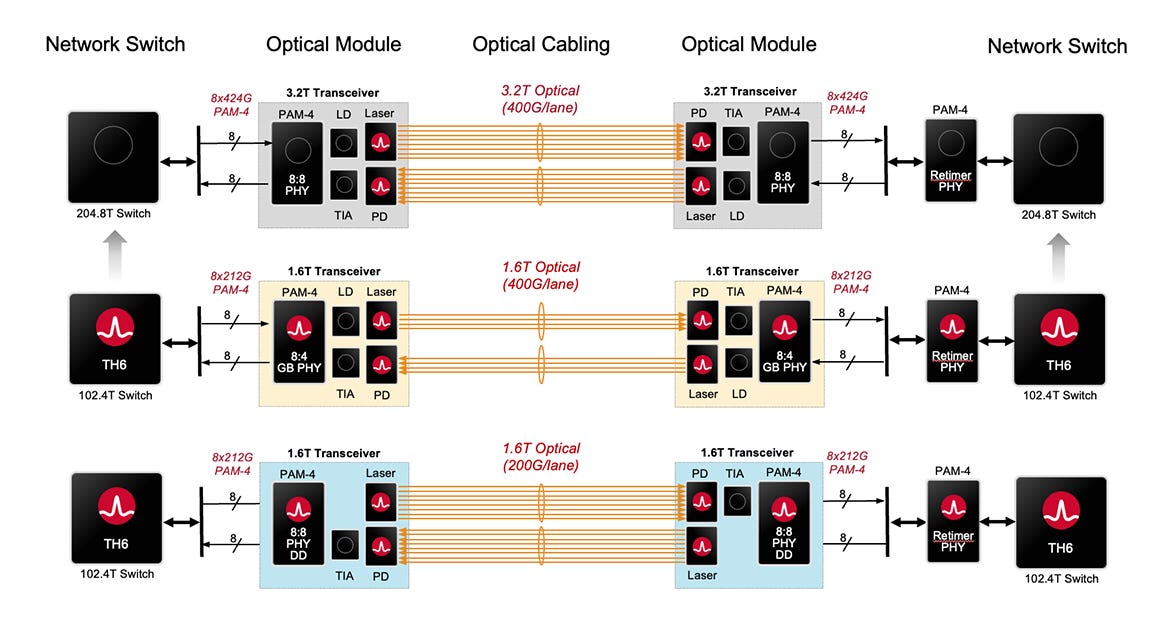With the 1.6T generation, the optical DSP has a 8-lane to 4-lane gearbox that now only requires 4-lanes running at 400G/lane in a transceiver. With the transition to 3.2T, all 8 lanes run at 400G - no gearboxing required. According to Broadcom’s product page: