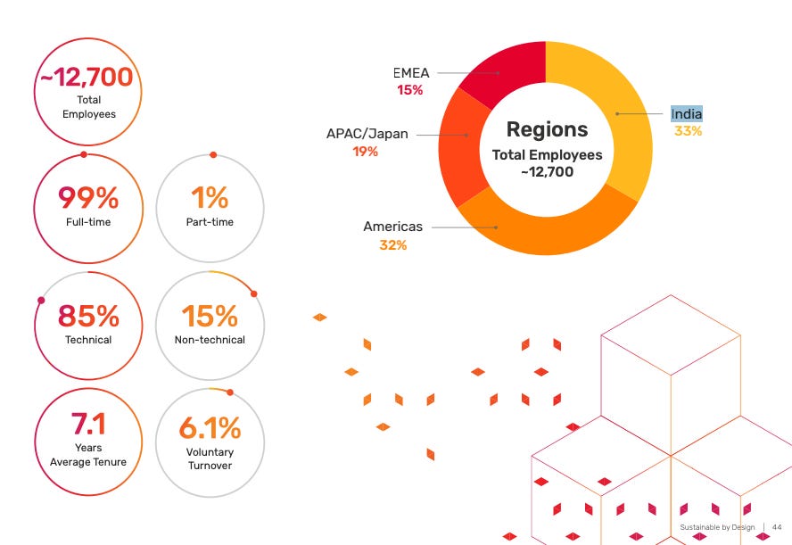 Several major American chip companies already have a significant footprint in India - in the major metropolitan cities of Bengaluru, Chennai, Hyderabad and Noida. For example, Intel India has 13,000 employees accounting for about 15-20% of the total workforce and is the largest design center outside the United States. Nvidia has anywhere between 4,000-10,000 employees (10-30%) of its workforce in India. A snapshot from Cadence’s 2024 annual corporate impact report shown below says that India has an even higher percentage of employees than in America. Another company I cannot talk about (legal pitchforks 🔱) has a significant presence too. The off-shore presence of these companies is only getting larger.