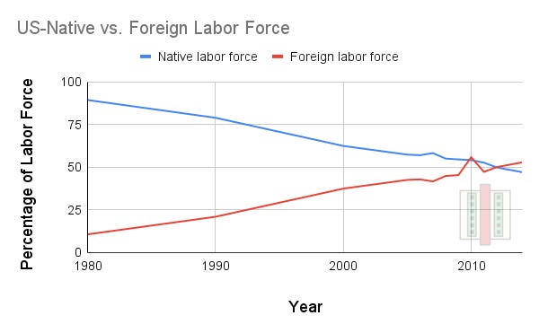 The chart below shows the results from a Bureau of Labor Statistics (BLS) study from 2017. The study looked at the ratio of native-born to foreign-born labor force in metropolitan IT companies from 1980 to 2014. With every passing decade, foreign born engineers have evolved to occupy a larger fraction of the workforce. Right about twelve years ago, foreign labor took a majority in the IT industry. This includes both software and hardware, but the ratios should broadly apply even if just looking at people working on chips. Extrapolating to present day, foreign labor dominates the technology industry. Lots of handwaving of course, but its the trend that is the message here.