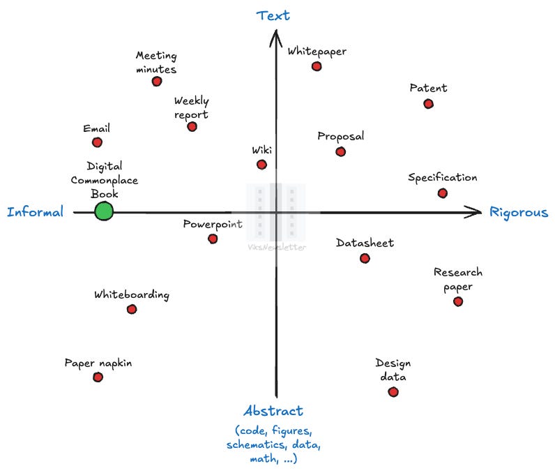 The following 2×2 grid shows the various types of documentation engineering teams often generate (we will discuss the digital commonplace book separately in the next section.) One axis shows the degree of formality in the documentation, which is directly correlated to how easily it can be created. Some forms of documentation are formal and rigorous, like research papers. Others are quick and informal, like emails.