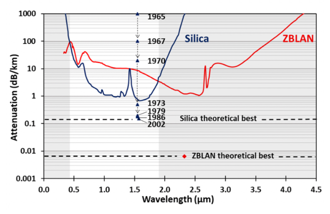 Remarkable optical properties: The low-loss, wide bandwidth and zero dispersion properties of ZBLAN meant that losses could be up to 100x lower than common silica fiber.