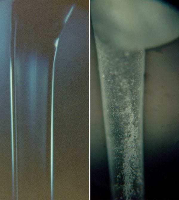 Notable progress however has been made by Flawless Photonics (Reno, NV). In 2024, they demonstrated about 7 miles of ZBLAN production in one month aboard the ISS. Their production rate exceeds about 1 kilometer per day. These space drawn fibers were then sent to earth and the comparison in quality is seen below. You can tell that the fiber manufactured in microgravity has far fewer defects.