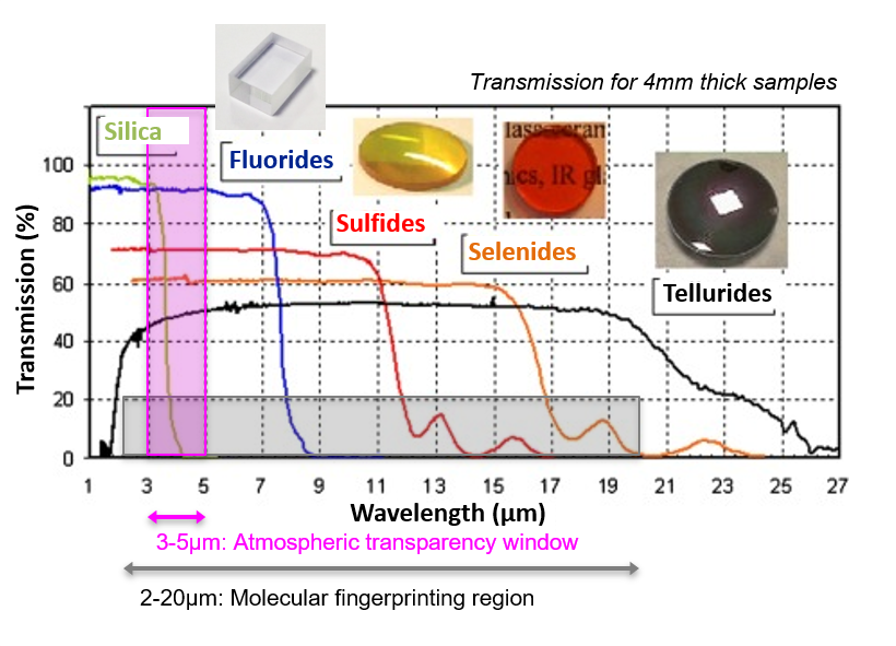 Another highly desirable property of ZBLAN being a fluoride glass is its very wide optical transmission window for wavelengths ranging from 0.4 microns to 4 microns (some fluoride glasses even work up to 7 micron wavelengths) with low transmission losses. This makes it useful for near-infrared or mid-infrared applications like spectroscopy.