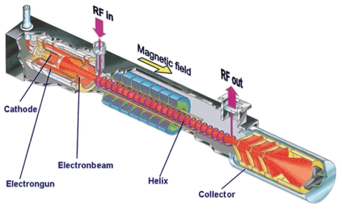 TWTAs using helix structures are capable of providing high power at high frequencies with broad bandwidth and good efficiency, while withstanding high temperatures. This explains why they have been so widely used in satellites. For example, Thales’ S-band (2.15—2.76 GHz) TWTA produces 275 W of RF output power, for satellite downlinks. The exceptional performance of TWTAs at Ka-band (27—40 GHz) is largely uncontested in terms of output power. However, their limitations primarily come from two sources: