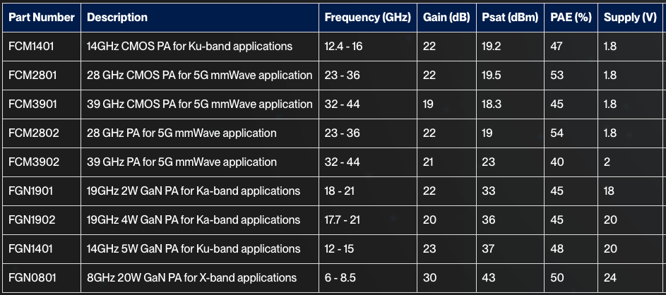 While a single TWTA can produce hundreds of watts of output power, SSPAs can produce up to 20W from a single chip with up to 50% efficiency using unique circuit architectures, as shown in Falcomm’s product portfolio below (some are still in development.) The same table shows the benefits of using GaN over CMOS to achieve high levels of output power (Psat).