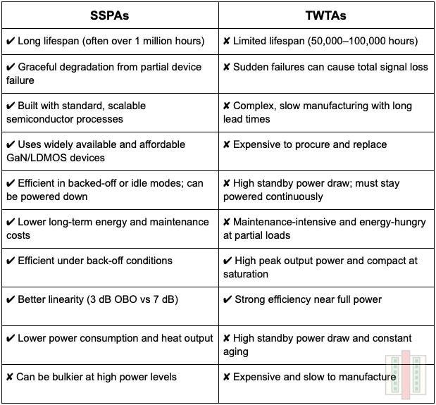 TWTAs still deliver high efficiency at peak power and have a compact form factor. But they are expensive and slow to manufacture, requiring precision alignment and vacuum sealing. Lead times can stretch to a year or more. Lifespan is limited, typically between 50—100 thousand hours, and failures can happen without warning, immediately disrupting service.