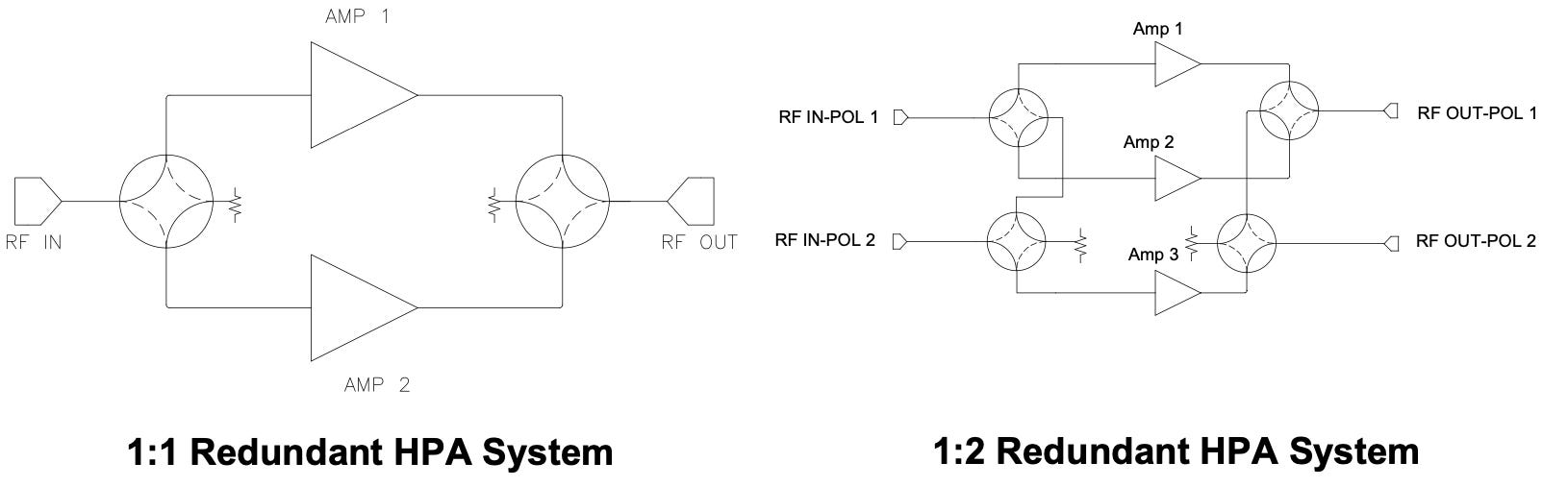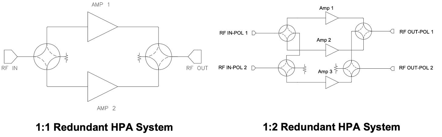 In a 1:1 redundancy system, there is an active amplifier and the other one acts as a spare, and can be switched in during failure of the active amplifier. The power switching circuits result in a loss of 2-3% of output power due to dissipative losses.